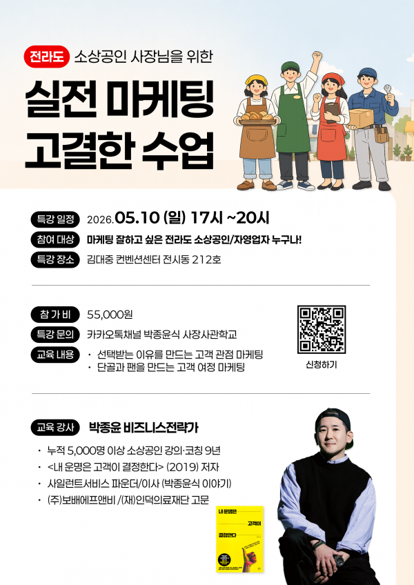 전국 5,000명 이상의 소상공인·자영업자 사장님이 참여한 오프라인 실전 마케팅 특강 < 고결한 수업>이 광주에서 진행됩니다.
